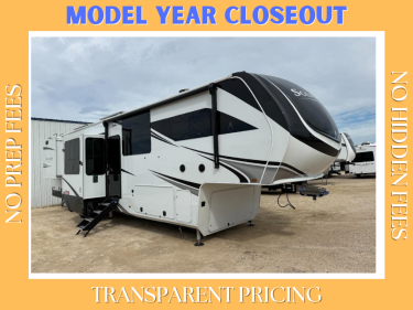 Designed for comfort on every journey, this spacious fifth wheel is ready for wherever the road takes you. The raised rear kitchen gives the cook plenty of room to whip up any type of meal using the stainless steel appliances including a built-in oven, an oversized pantry, and the raised bar top will provide you even more counter space on top of dining with two chairs that overlook the middle living area. Relaxing is made easy thanks to two tri-fold sofas and theatre seating while watching the big game on the LED Smart TV and enjoying the fireplace below. At night, retire to your own queen bed which slides out to provide more floor space, and you can store your clothes in the slide top dresser and front closet with washer and dryer prep.