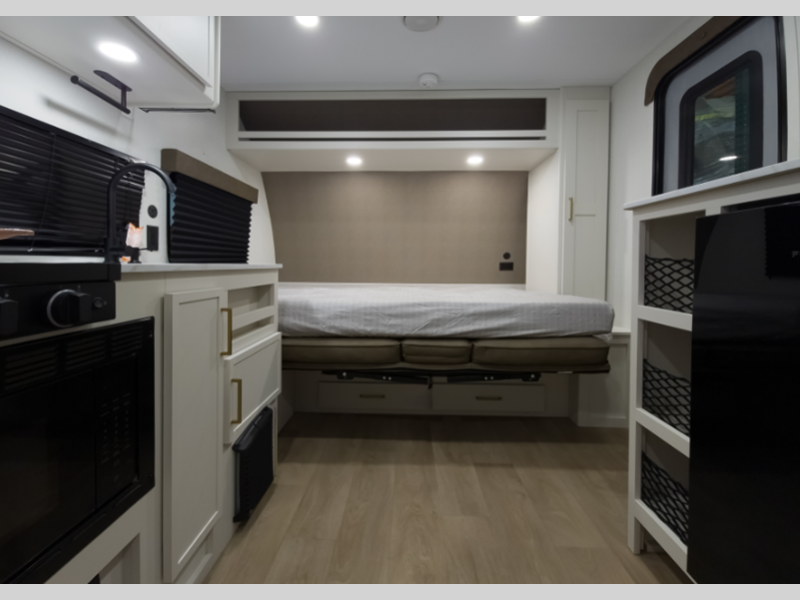 Sleeps 2 Length 15 ft 10 in Ext Width 8 ft Ext Height 10 ft 3 in Int Height 6 ft 6 in Hitch Weight 364 lbs GVWR 4420 lbs Dry Weight 2950 lbs Fresh Water Capacity 37 gals Grey Water Capacity 37 gals Black Water Capacity 37 gals Tire Size ST215/75R14LRD Furnace BTU 20000 btu Available Beds Queen Murphy Bed Refrigerator Type 12V Refrigerator Size 3 cu ft Cooktop Burners 2 Shower Size 24" x 32" Number of Awnings 1 LP Tank Capacity 20 Water Heater Type Tankless AC BTU 8000 btu Awning Info 9' Power Awning w/ Fusion Light Axle Count 1 Number of LP Tanks 2 Shower Type Walk-In Shower Similar Floorplans