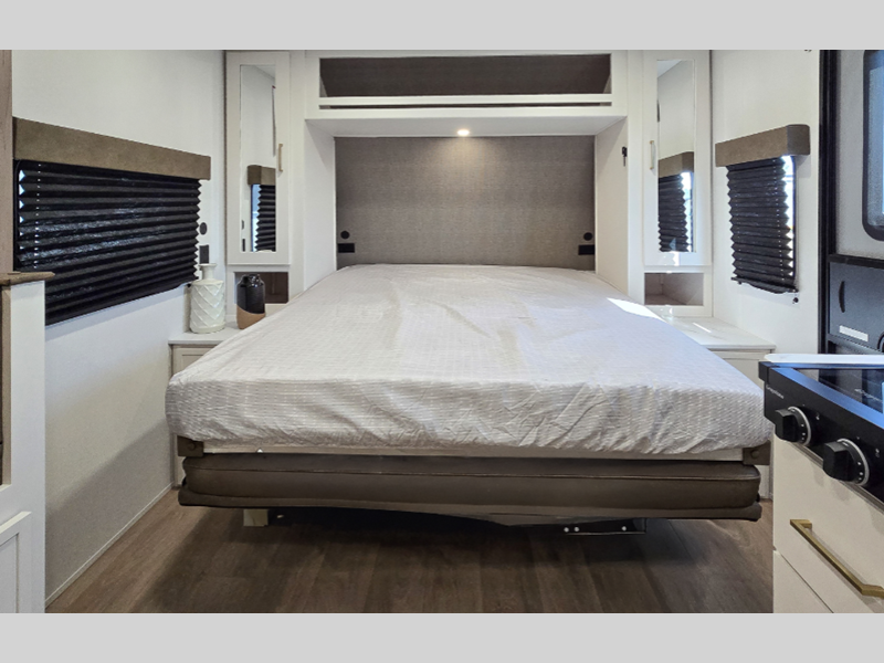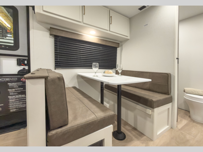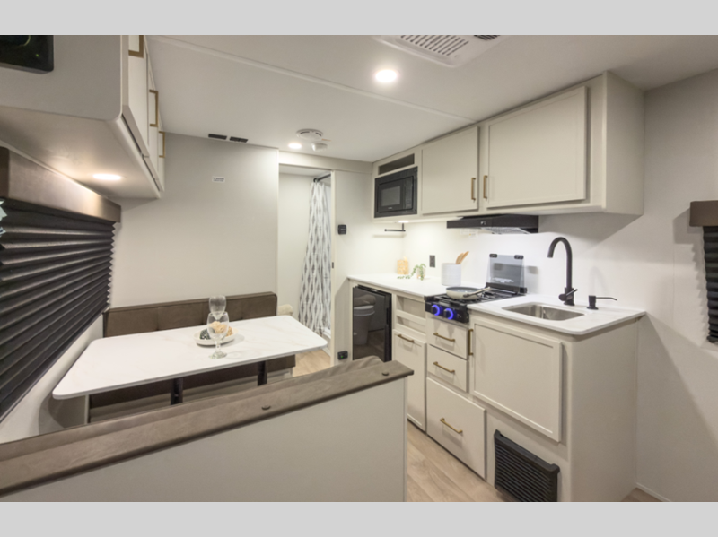 Each model is constructed to a superior standard with an insulated floor and enclosed underbelly plus residential insulated walls that will help with temperature regulation and moisture control. The 6' 6" interior height, tinted windows, and residential cabinet doors will make your space feel a little more like home, and the black automotive glass entry door is ultra sleek. You will find a power awning with a Fusion light outside, along with magnetic storage door catches, a Leash Link/bottle opener, and more convenient features!