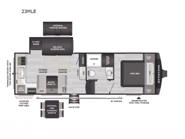 You'll love camping in this rear kitchen fifth wheel that can sleep five to six! Up front, you will enjoy a private bedroom with a king bed and bedside wardrobe/nightstands as well as a wardrobe with washer and dryer prep. A complete bath provides a large shower, toilet and sink, plus linen storage which you are sure to appreciate as you travel. There are plenty of options for this unit making it easy to customize to your use and style. The theater seating and free standing dinette options can be selected in place of the sleeper sofa and booth dinette if you prefer. There is also a 16' awning to create even more living space to enjoy, and the unobstructed pass-through storage compartment can easily house all of your outdoor camping gear like lawn chairs and yard games.