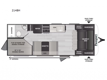 Your kids will love this travel trailer! The double-size bunks provide comfortable sleeping quarters, while the booth dinette offers a cozy spot for meals and relaxation. The full bathroom features everything you need to take care of yourself and is convenient on the go, plus, a refrigerator, microwave, and two-burner cooktop make meal prep a breeze. The overhead cabinets and pantry provide ample storage for your favorite spices and belongings. Moreover, the Murphy bed offers additional sleeping space, and the wardrobe and nightstand on each side of the bed provide convenient storage and comfort. On the outside, you will find A 17' awning that provides shade and protection, while pass-thru storage offers additional space for gear and equipment.