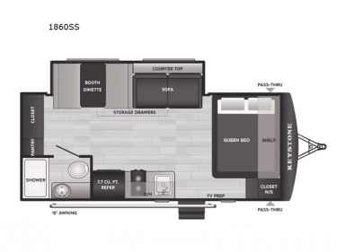 When you want to explore the outdoors and relax indoors, this trailer will provide the comforts, conveniences and many of the wants you will need to do both! The interior is spacious with the large slide out which includes a booth dinette and sofa, both with storage drawers. And the furniture doubles as sleeping space when you have overnight guests. There is a pantry and a closet next to the full bathroom which is handy, and the galley kitchen offers a 7.7 cu. ft. 12V refrigerator to store the cold items. You will also sleep soundly each night on the front queen bed. The exterior offers a 15' power awning plus a pass-thru compartment for your outdoor camping chairs, tables, charcoal and more.