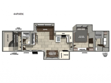 Sleeps 7 Slides 3 Length 44 ft Ext Width 8 ft Ext Height 13 ft 4 in Int Height 6 ft 10 in Hitch Weight 1475 lbs Dry Weight 11053 lbs Cargo Capacity 2422 lbs Fresh Water Capacity 60 gals Grey Water Capacity 114 gals Black Water Capacity 76 gals Furnace BTU 30000 btu Number Of Bunks 2 Available Beds King Refrigerator Type Stainless Steel 12V Refrigerator Size 16.2 cu ft Cooktop Burners 3 Water Heater Type Tankless AC BTU 30000 btu TV Info LR Smart TV Awning Info Electric with LED Lights Axle Count 2 Washer/Dryer Available Yes Shower Type Standard Electrical Service 50 amp Solar Wattage 200 watts Similar Travel Trailer Floorplans