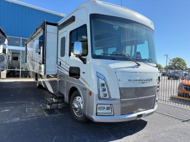 Sleeps 5 Slides 3 Length 37 ft 3 in Ext Width 8 ft 6 in Ext Height 12 ft 4 in Int Height 7 ft 1 in Interior Color Organic Comfort Dark, Organic Comfort Light, Bohemian Oasis Exterior Color Full-Body Paint; Silvermist, Wedgewood ll, Steel Grey, Night Sky Hitch Weight 5000 lbs GVWR 24000 lbs Fresh Water Capacity 93 gals Grey Water Capacity 83 gals Black Water Capacity 75 gals Tire Size 22.5" Furnace BTU 40000 btu Generator 5,500-Watt Cummins Onan Marquis Gold Fuel Type Gas Engine 7.3L V8 Chassis Ford F53 Fuel Capacity 80 gals Wheelbase 242 in Available Beds King Refrigerator Type Stainless Steel Residential with Ice Maker and Water Dispenser Convection Cooking Yes Cooktop Burners 2 Shower Size 30" x 36" Number of Awnings 1 Axle Weight Front 9000 lbs Axle Weight Rear 15000 lbs LP Tank Capacity 76.14 lbs Water Heater Capacity 10 gal Water Heater Type 110V/LP AC BTU 28500 btu Basement Storage 141 cu. ft. TV Info BR 32" HDTV, Ext. 32" HDTV Awning Info 19' Power w/LED Lighting Washer/Dryer Available Yes Gross Combined Weight 30000 lbs Shower Type Standard Electrical Service 50 amp Similar Motor Home Class A Floorplans