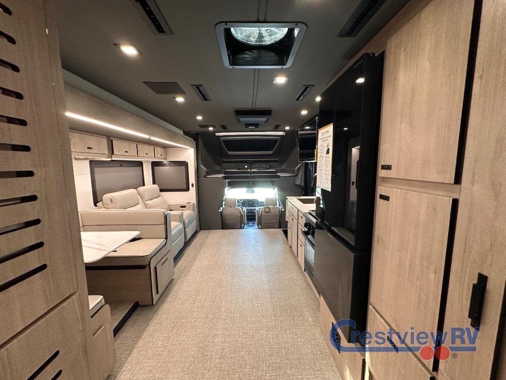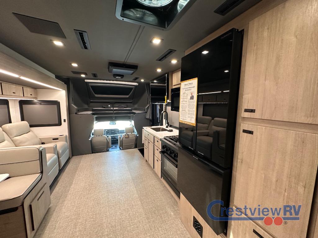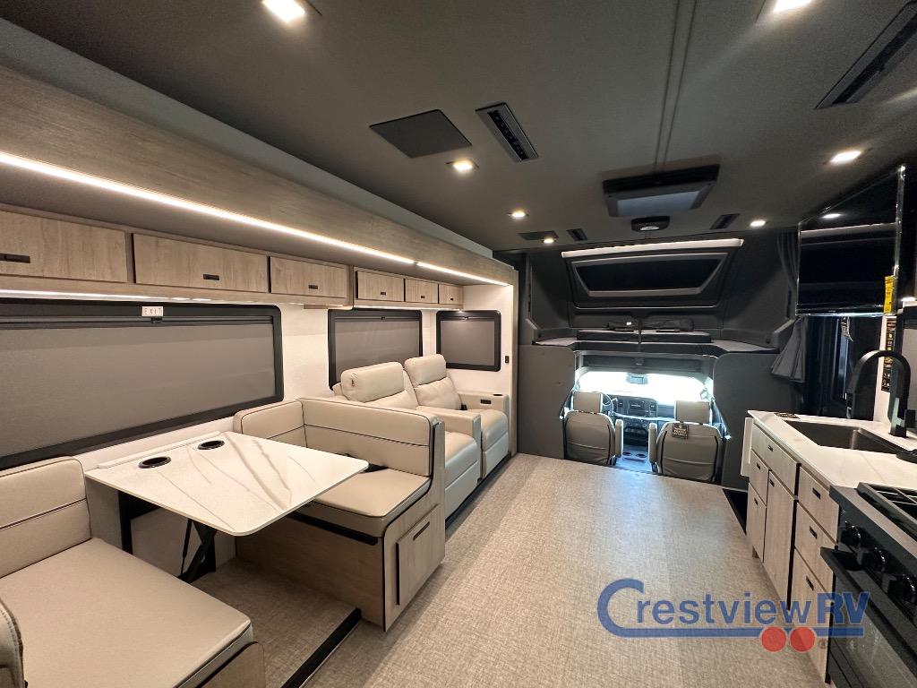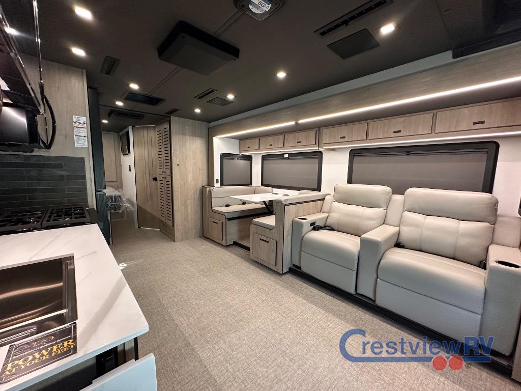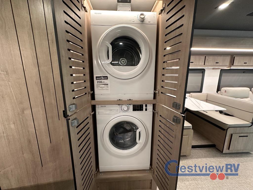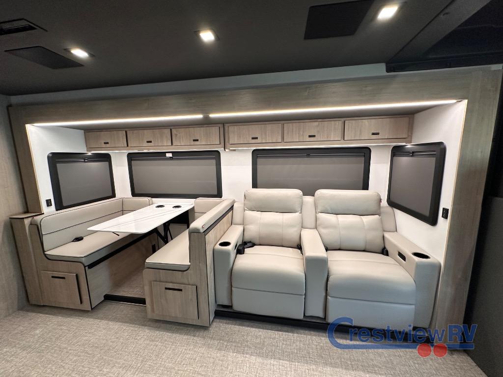 You can be sure to enjoy the journey and the stay in this coach! Once you stop for the day, you can make lunch with the kitchen appliances, then dine at the booth dinette within the large slide out. There is also power theater seating here across from a TV for easy viewing. A 10 cu. ft. 12V refrigerator and pantry will let you keep food stocked, and the closet with washer and dryer prep gives you the option to add these appliances. The 70" x 80" king bed slide is sure to provide a great night's rest, and there is a wardrobe to keep your things tidy. And of course, a full rear corner bath onboard makes staying fresh easier than ever!