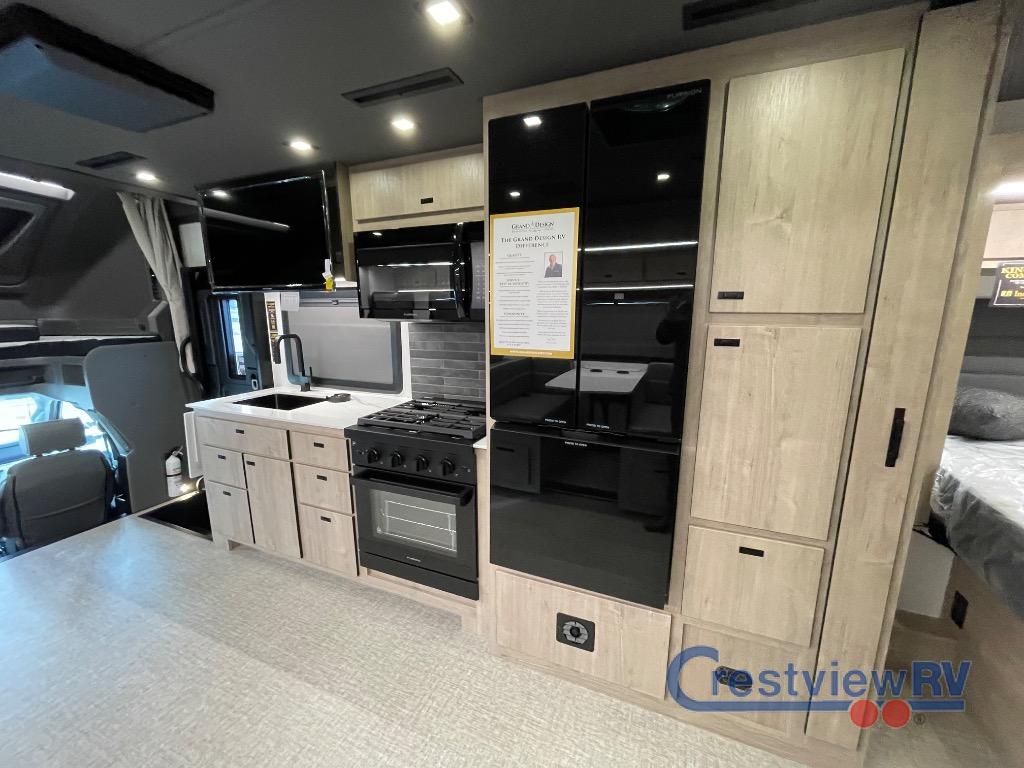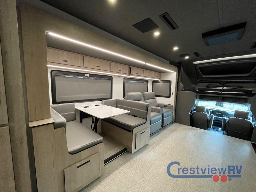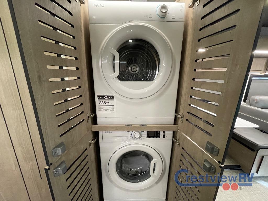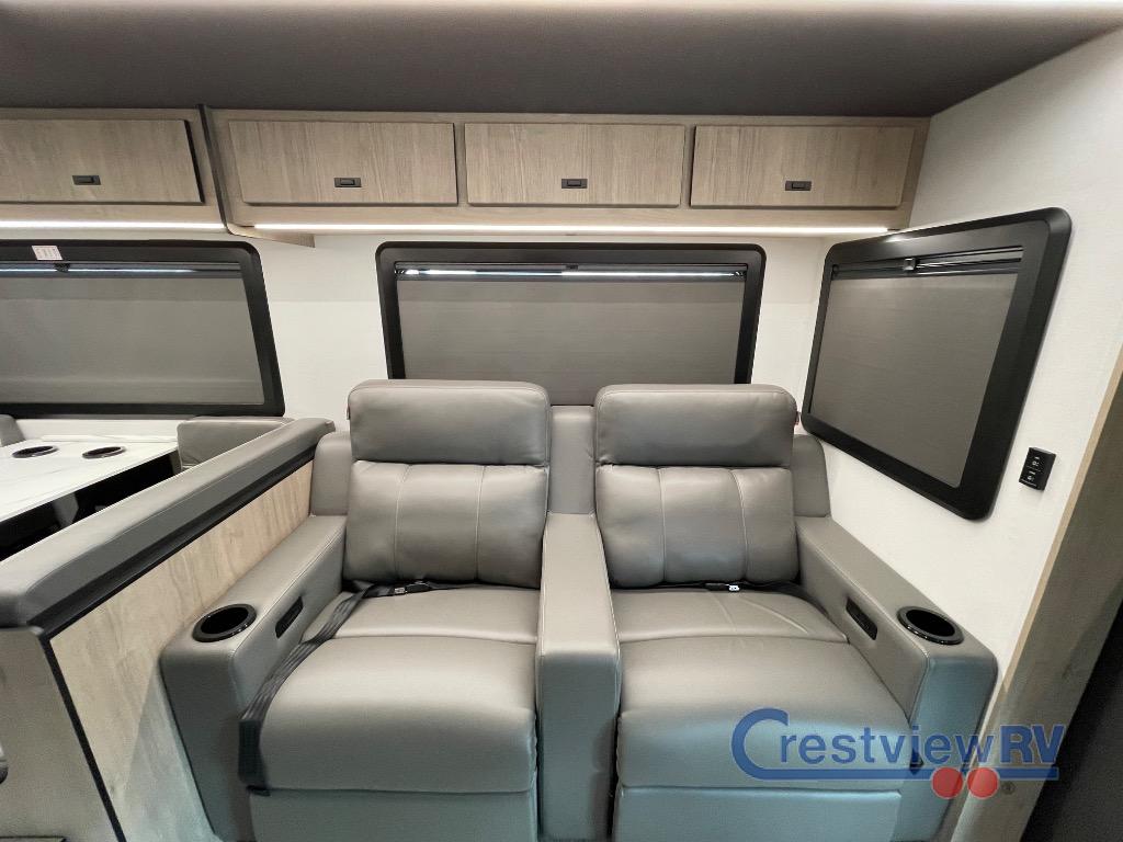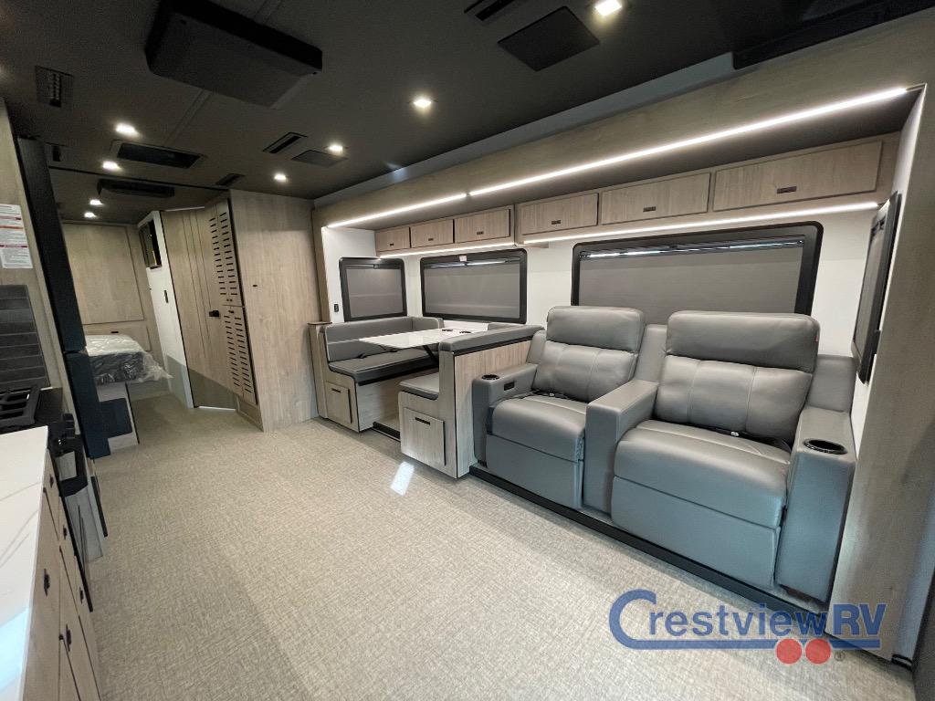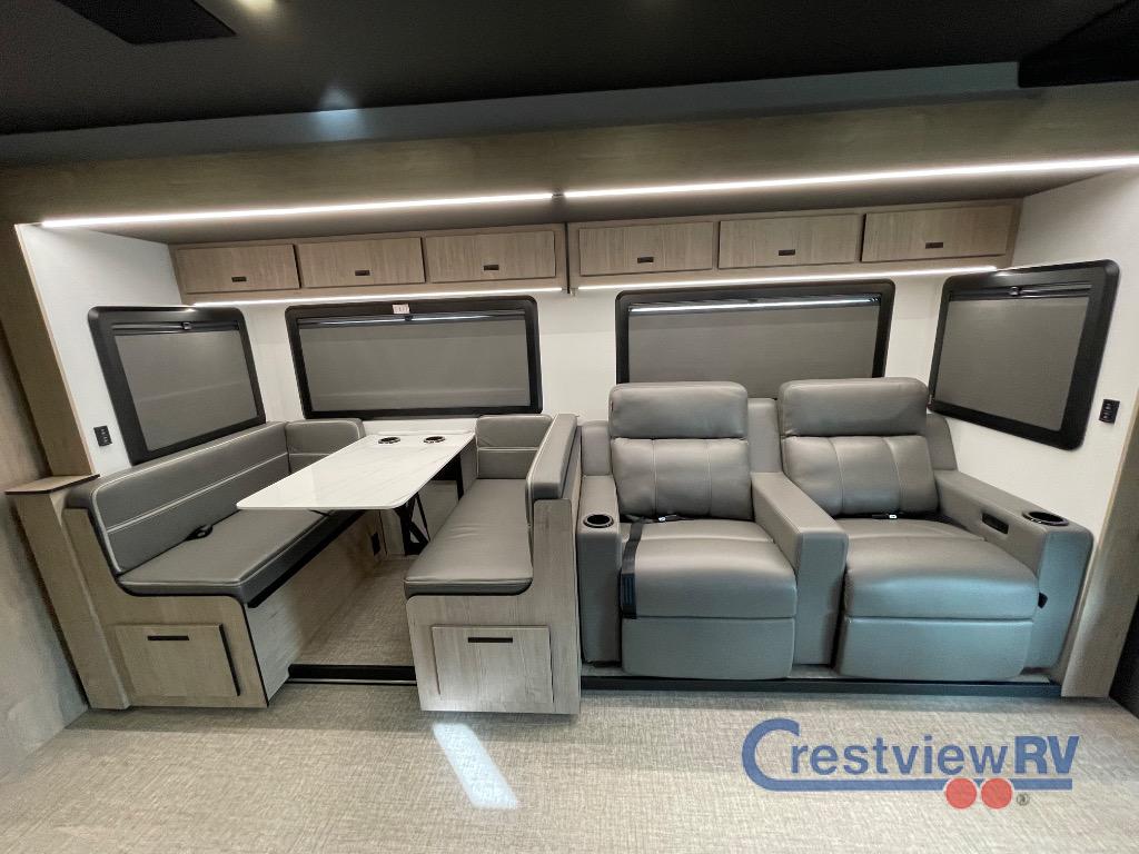 You can be sure to enjoy the journey and the stay in this coach! Once you stop for the day, you can make lunch with the kitchen appliances, then dine at the booth dinette within the large slide out. There is also power theater seating here across from a TV for easy viewing. A 10 cu. ft. 12V refrigerator and pantry will let you keep food stocked, and the closet with washer and dryer prep gives you the option to add these appliances. The 70" x 80" king bed slide is sure to provide a great night's rest, and there is a wardrobe to keep your things tidy. And of course, a full rear corner bath onboard makes staying fresh easier than ever!