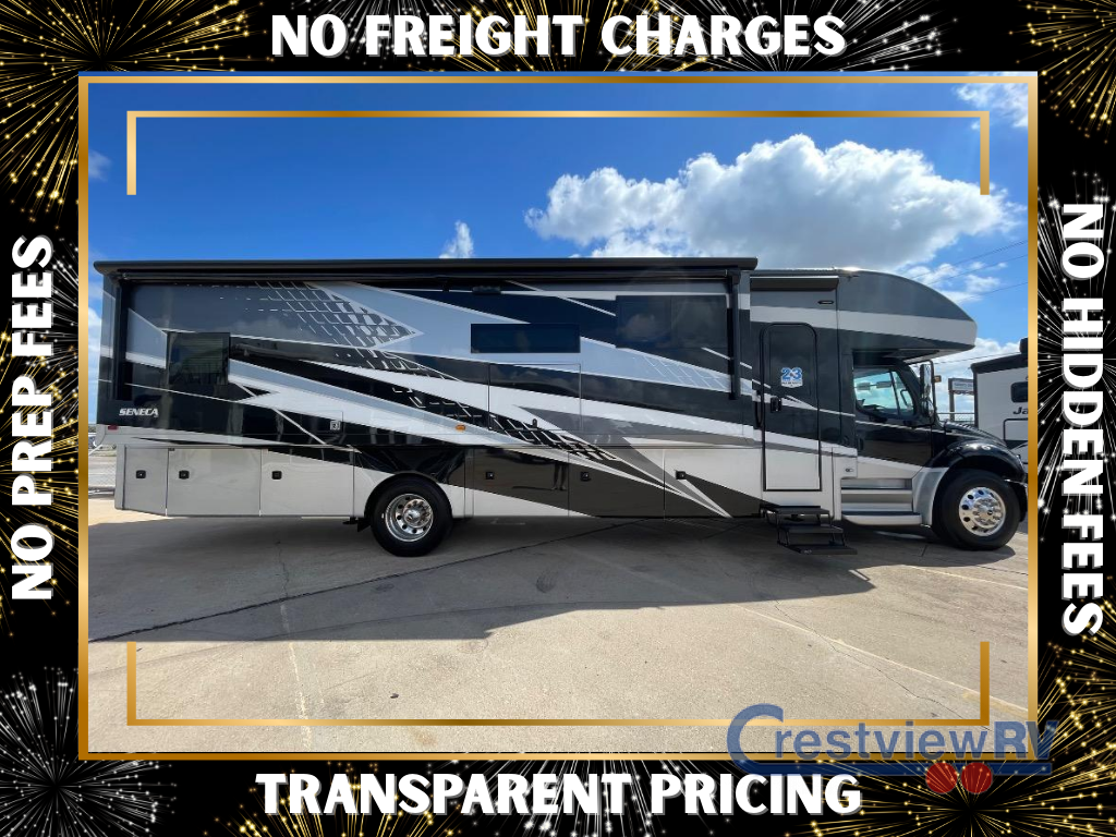 Join your fellow RVers on the road in your very own luxurious Seneca Prestige Super C diesel motorhome! You will have plenty of interior living space because of the full-wall slide and the additional two slides, so you can invite some of your friends over for a game night. Make a special meal for those guests on the two-burner induction cooktop and keep your beverages cool in the stainless steel residential refrigerator. You can have everyone sit down at the 42" x 70" booth dinette, and after dinner is over, you can all take your places on the 72" theater sofa and jackknife sofa with coffee and dessert. Lastly, you'll be grateful to find a bunk above the cab when you invite your friends to stay the night.