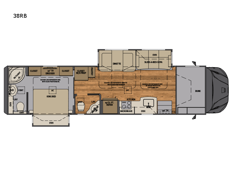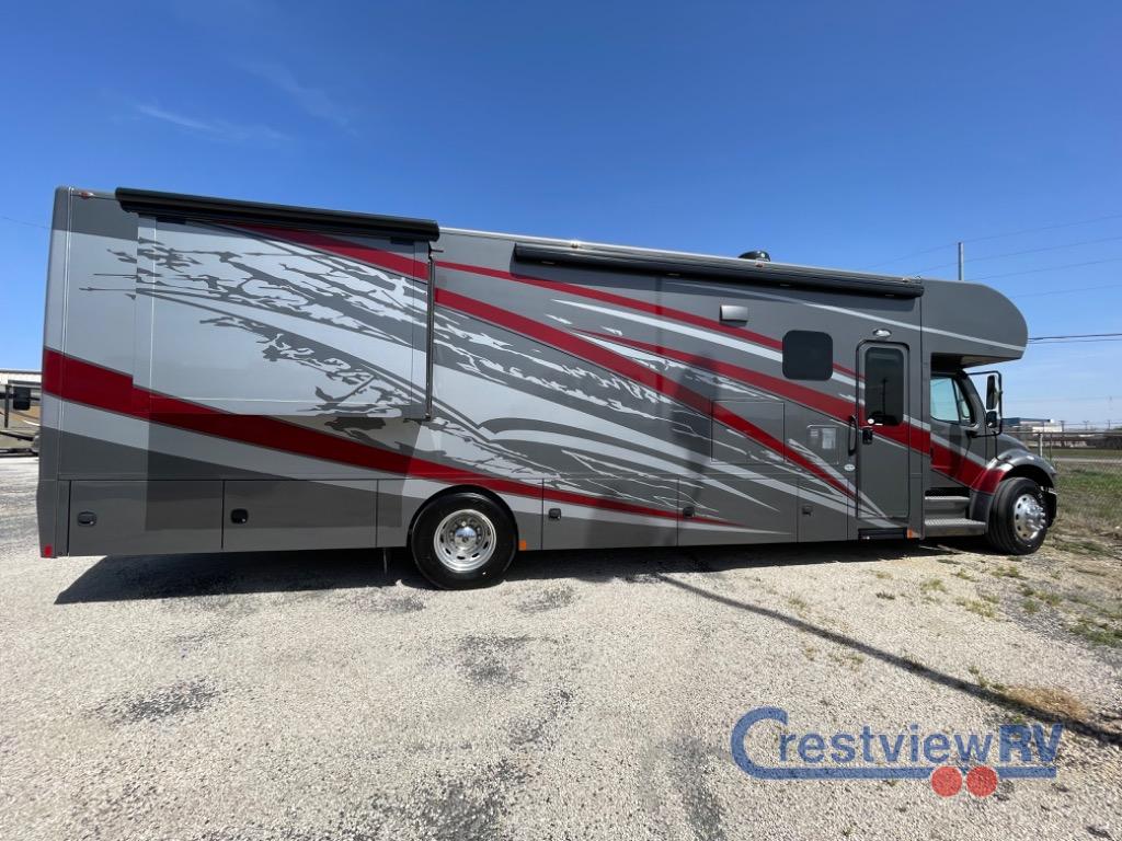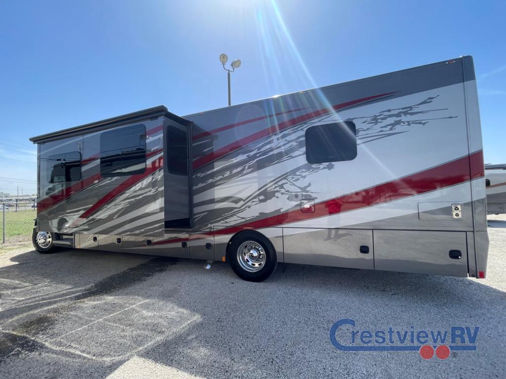 Start traveling the right way with this motorhome! There is plenty of entertainment throughout the inside and outside between the exterior entertainment center with a 32" TV, a 39" TV in the living area, and a 32" TV in the private bedroom. Across from the half bathroom is an area prepped to add an optional washer and dryer so you can have clean clothes for your entire trip. The master suite has a king bed to lay your head on at night and access to the full rear bathroom which has a radius shower with a skylight above for natural lighting and overhead cabinets to store your toiletries. The slide-a-bed sofa and booth dinette offer comfortable places to enjoy meals, socialize, and even transform into sleeping spaces!